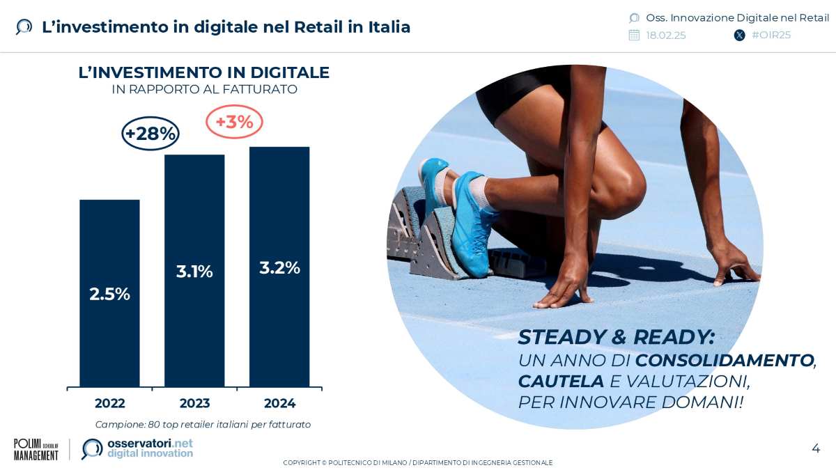 Il 2024 è, per il Retail, l’anno del consolidamento dei progetti di innovazione più performanti avviati nel 2023: l’incidenza degli investimenti in digitale sul fatturato dei retailer cresce lievemente ed è pari al 3,2% (rispetto al 3,1% nel 2023). L’instabilità di contesto e la moderata crescita dei consumi a causa dell’inflazione stanno ridimensionando la spesa in digitale del Retail italiano.