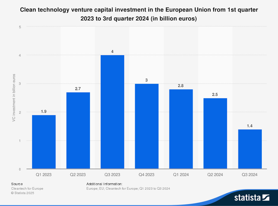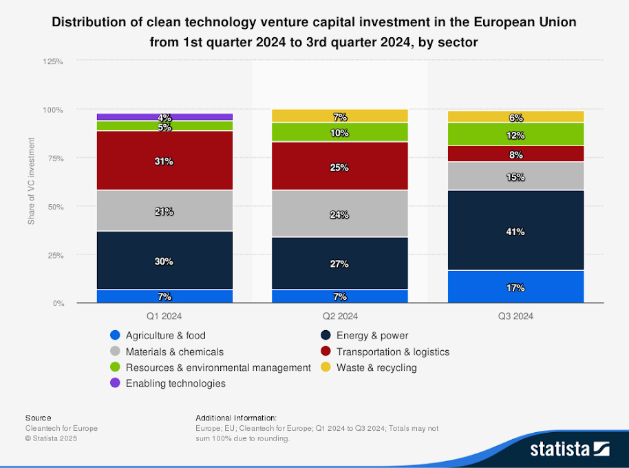 Con l’aumento della pressione per raggiungere gli obiettivi di sostenibilità 2030 e ridurre le emissioni di CO2, il settore cleantech, già in crescita da diversi anni, si prepara ora a uno sviluppo esponenziale. Un’analisi di Statista sulla distribuzione degli investimenti in venture capital in Europa nel 2024 – che ha visto il settore cleantech attrarre 1,4 miliardi di euro nel 3Q (img.1)- mostra come nel terzo trimestre il settore energetico abbia ricevuto il 41% degli investimenti totali in tecnologie cleantech. Anche il comparto AgriTech ha registrato una significativa crescita, con la sua quota di investimenti che è passata dal 7% nel secondo trimestre 2024 al 17% nel terzo. In calo, ma saldo al terzo posto, il settore delle materie e dei prodotti chimici, che ha visto una riduzione degli investimenti dal 21% del secondo trimestre al 15% nel terzo. Seguono i settori della gestione delle risorse ambientali, dei trasporti, della logistica e della gestione dei rifiuti (img.2)