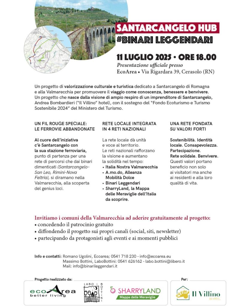 L’11 luglio alle ore 18.00 presso Ecoarea (Cerasolo, RN) alla presentazione ufficiale di Santarcangelo HUB, un progetto culturale e turistico che valorizza la Valmarecchia attraverso la lente della mobilità dolce, della sostenibilità e del genio loci.
